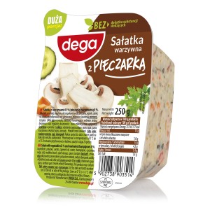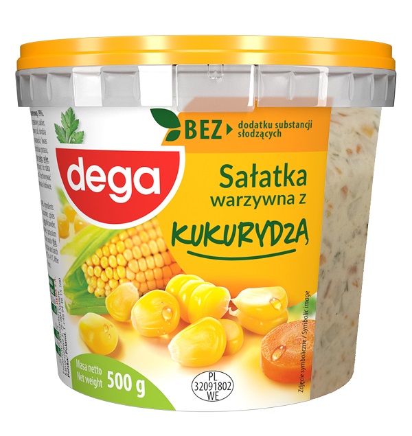 Sałatka z warzywami 73 % z kukurydzą konserwową 12 %. Główne składniki: ziemniaki, marchew, kukurydza, olej rzepakowy, woda, cukier, ogórek, przyprawy (zawierają gorczycę), sól, ocet spirytusowy, skrobia modyfikowana, śmietana w proszku (z mleka); żółtko jaja w proszku, regulatory kwasowości: kwas mlekowy, kwas cytrynowy; substancje konserwujące: sorbinian potasu, benzoesan sodu; ekstrakt kopru.