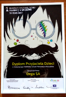 W dniach 21-23 marca 2017 podczas 2 Dziecięcego Festiwalu Filmowego firma Dega otrzymała zaszczytny tytuł Przyjaciela Dzieci.