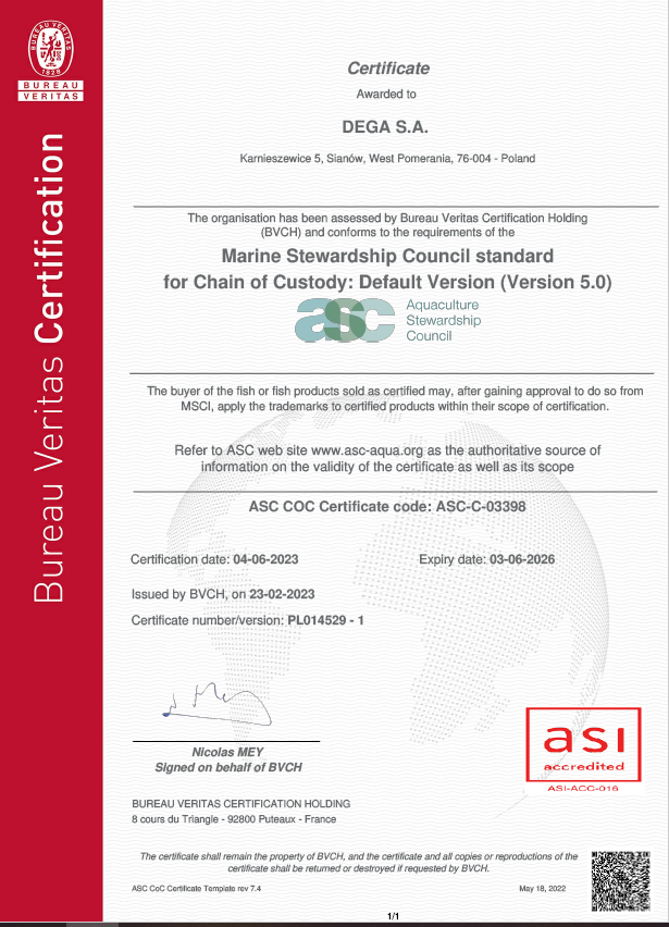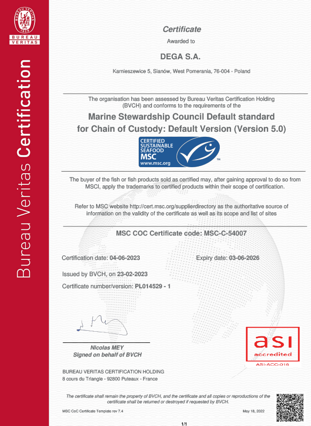 Uzyskaliśmy również pozytywny wynik audytu MSC (Marine Stewardship Coucil) - otrzymując tym samym certyfikat międzynarodowego zrównoważonego rybołówstwa. Uzyskane certyfikaty gwarantują naszym Klientom bezpieczne wyroby, o stałej, powtarzalnej, najwyższej jakości.