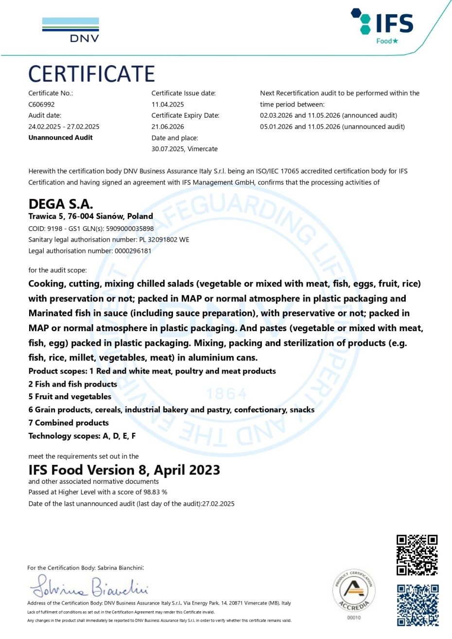 Dzięki konsekwentnie realizowanej polityce rozwoju od 2004 roku jesteśmy przedsiębiorstwem, które spełniło warunki niezbędne do konkurowania na rynku Unii Europejskiej. Corocznie przechodzimy pomyślnie kolejne audyty certyfikujące potwierdzające wdrożony i stosowany Zintegrowany System Zarządzania jakością na zgodność z wymaganiami standardów IFS Food i BRC Food Safety.